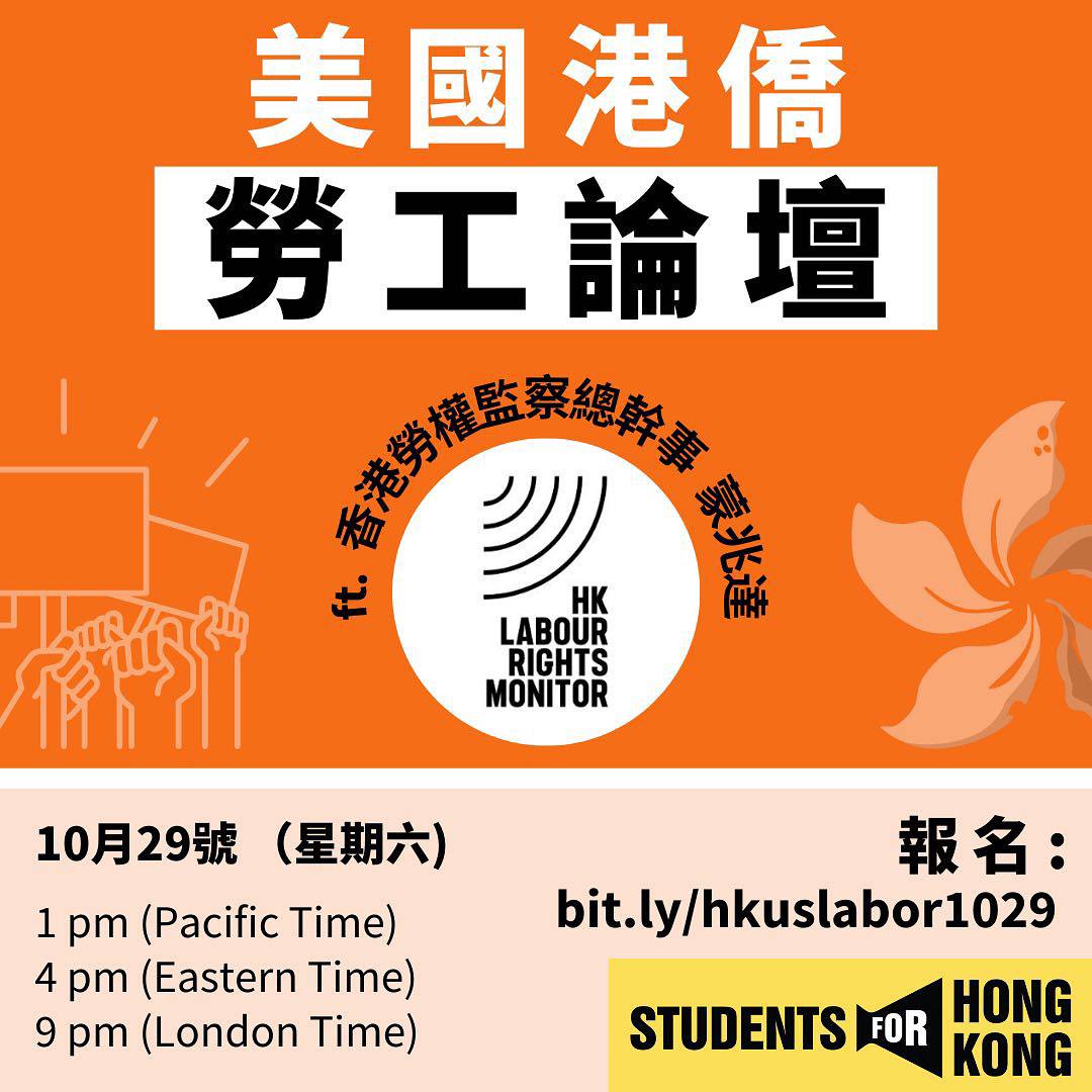 喺過去一年,喺美國不少新興行業例如星巴克同亞馬遜嘅員工都紛紛成立工會。美國工運潮對香港獨立工會有咩啟示?面對著美國龐大嘅工會網絡,在美港人又可以如何參與並延續我哋嘅國際工運戰線?我哋嚟緊會搞一系列嘅論壇同工作坊,讓在美港人明白自己嘅勞工權益,關心美國同香港兩地嘅工運狀況,並建立起美國嘅港人工運戰線。我哋首個論壇將邀請 @hklabourrights 香港勞權監察總幹事蒙兆達,為我哋講解何謂國際工運戰線並介紹香港勞權監察現時嘅工作。
