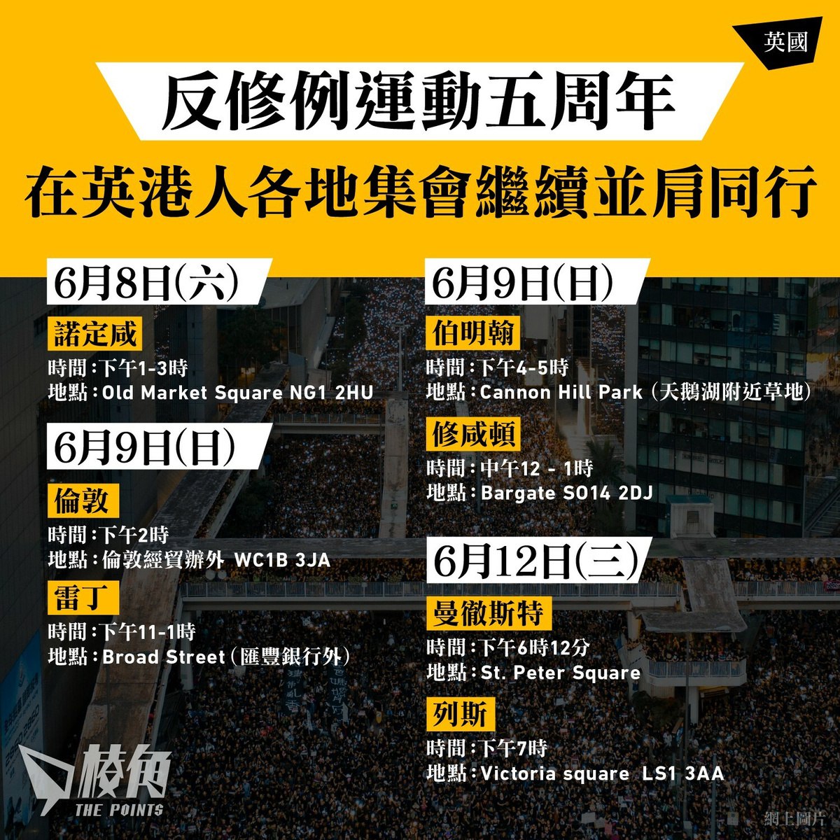 2019年6月9日是香港抗爭史上標誌性的一天,超過一百萬香港人走上街頭,抗議立法會表決《逃犯條例》,觸發「反修例運動」,改寫香港的命運。五年過去,香港已無法舉行示威集會,身處英國的港人將抗爭帶到各地。由本周末起,多個港人組織發起集會及遊行。
