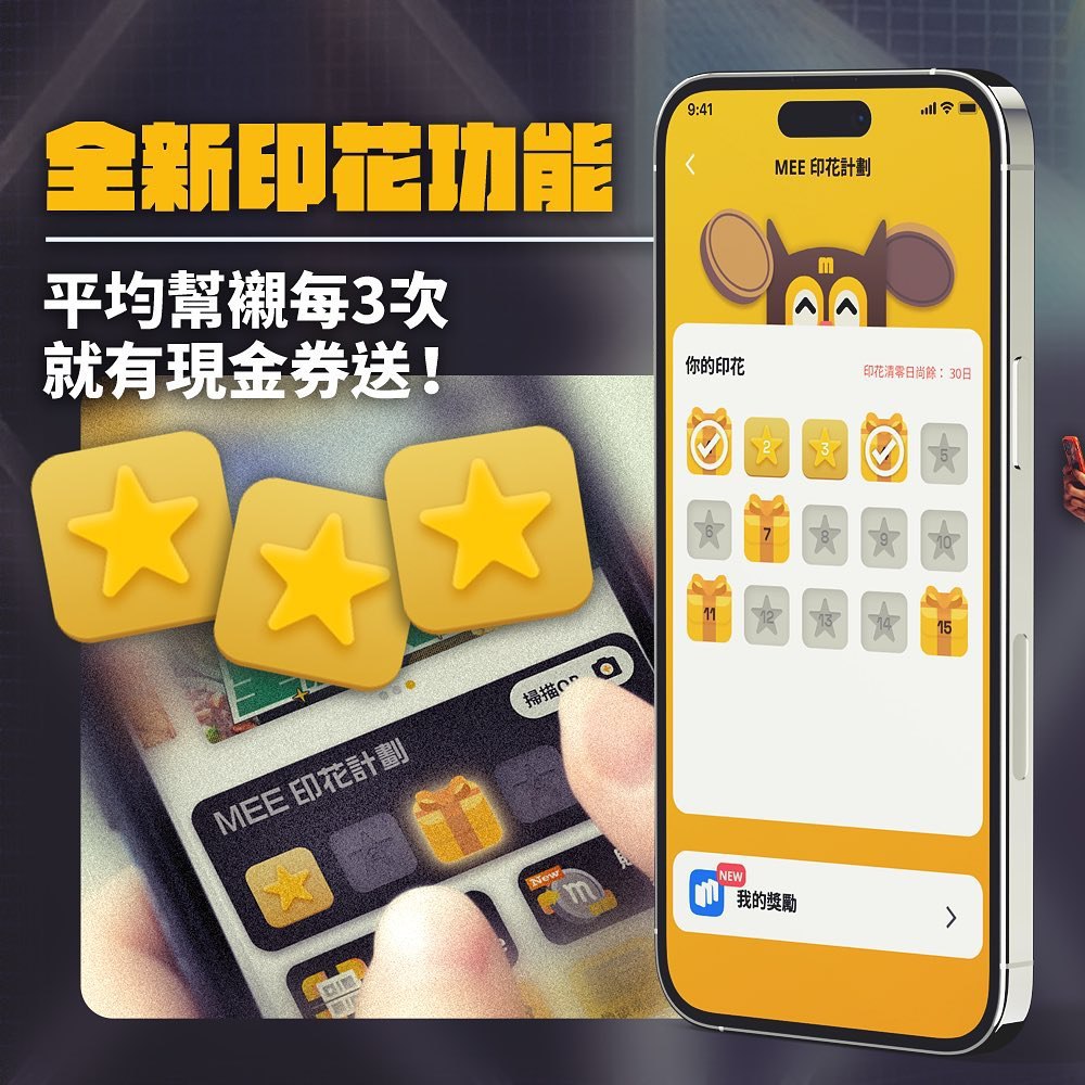 儲Mee分同時儲印花,平均每消費3次黃店就能夠獲得下一份獎賞,大部份獎賞以app內全新系統即時換領,即換即用!