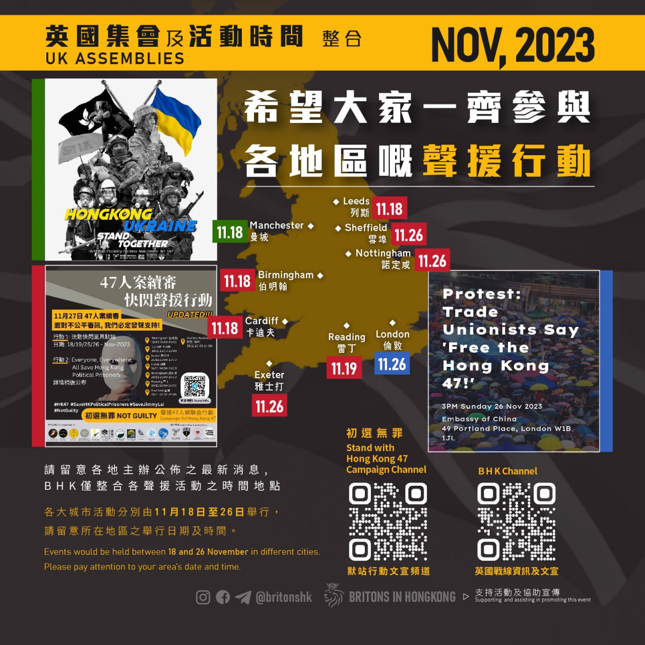 各個英國及海外港人組織希望再次透過聯合行動,將香港政治逼害嘅真相帶俾公眾。除此之外,我哋都想對身在牆內嘅所有手足表示支持。面對持續不公平嘅審訊,無了期嘅監禁,我哋需要發聲!