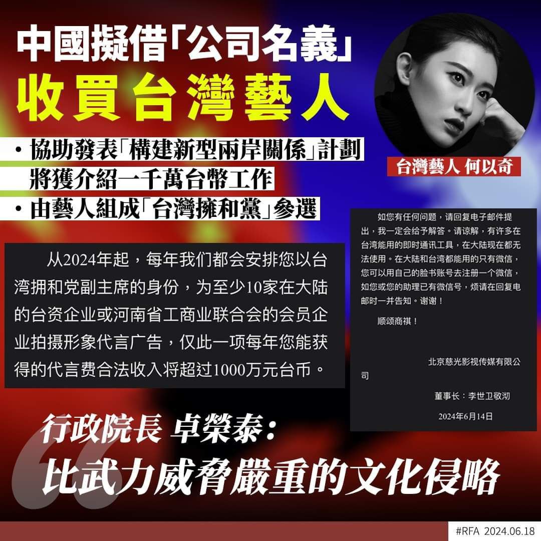 何以奇在社交平台發文,公開一封由「北京慈光影視傳媒公司」寄發的「合作邀約」方案電郵,內容提到「構建新型兩岸關係」計劃,指台灣藝人協助發表後,將介紹中國的工作機會,年收入達1千萬新台幣以上。方案中更提及成立「台灣擁和黨」,希望由具綠營背景的寶島歌王余天擔任黨主席,合作藝人擔任副主席,計劃投入明年的台灣地方選舉。