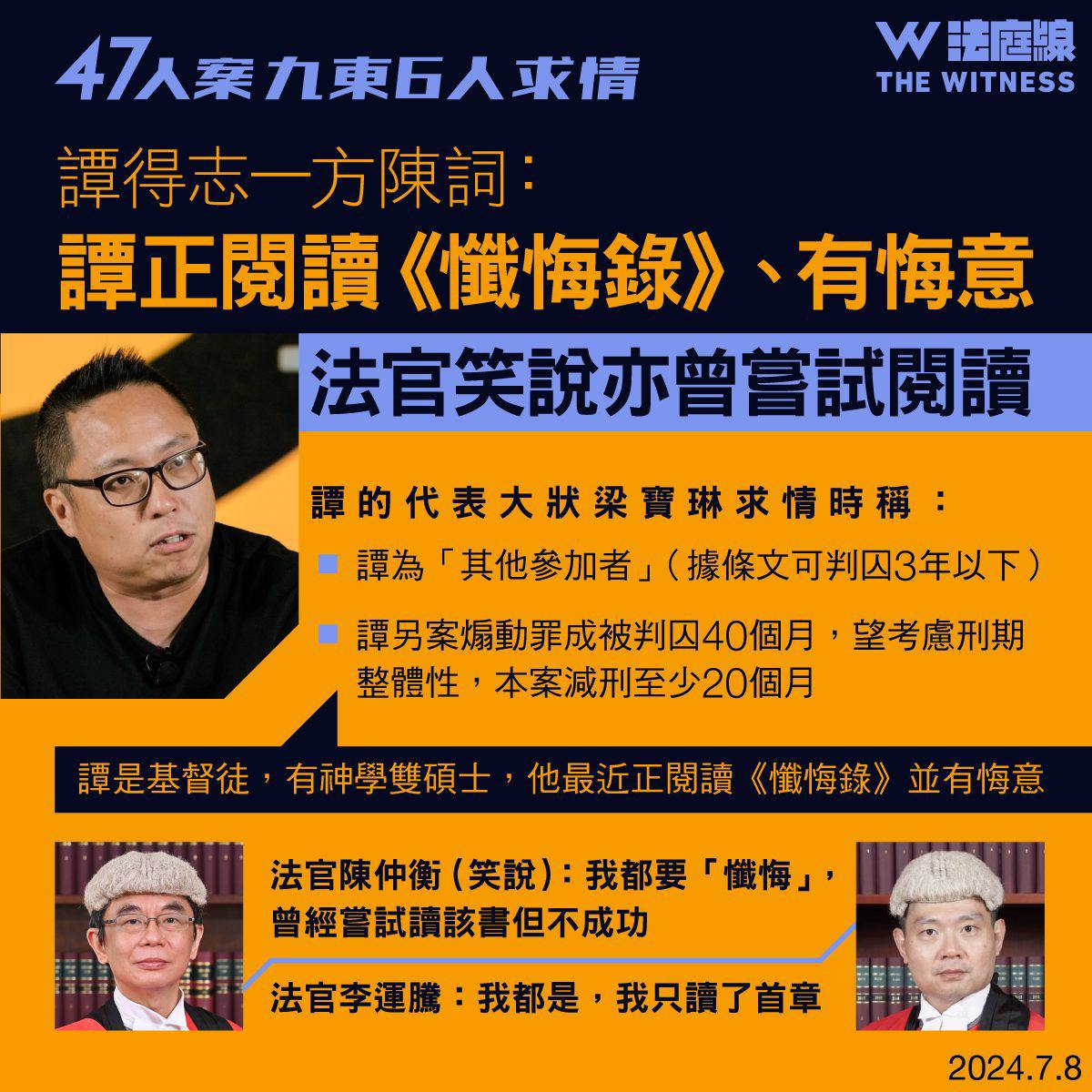 47人案求情|譚得志一方指正閱讀《懺悔錄》、有悔意 法官笑說亦曾嘗試閱讀