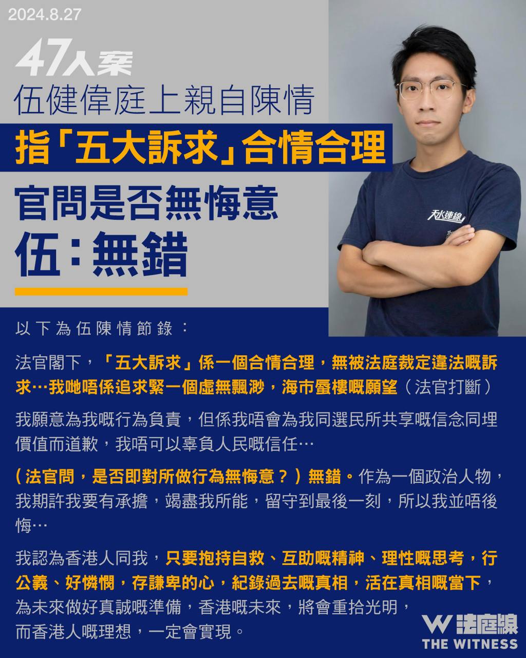 47人案|伍健偉親自陳情庭上紀錄 稱留港兌現向港人承諾 回答法官確認無悔意