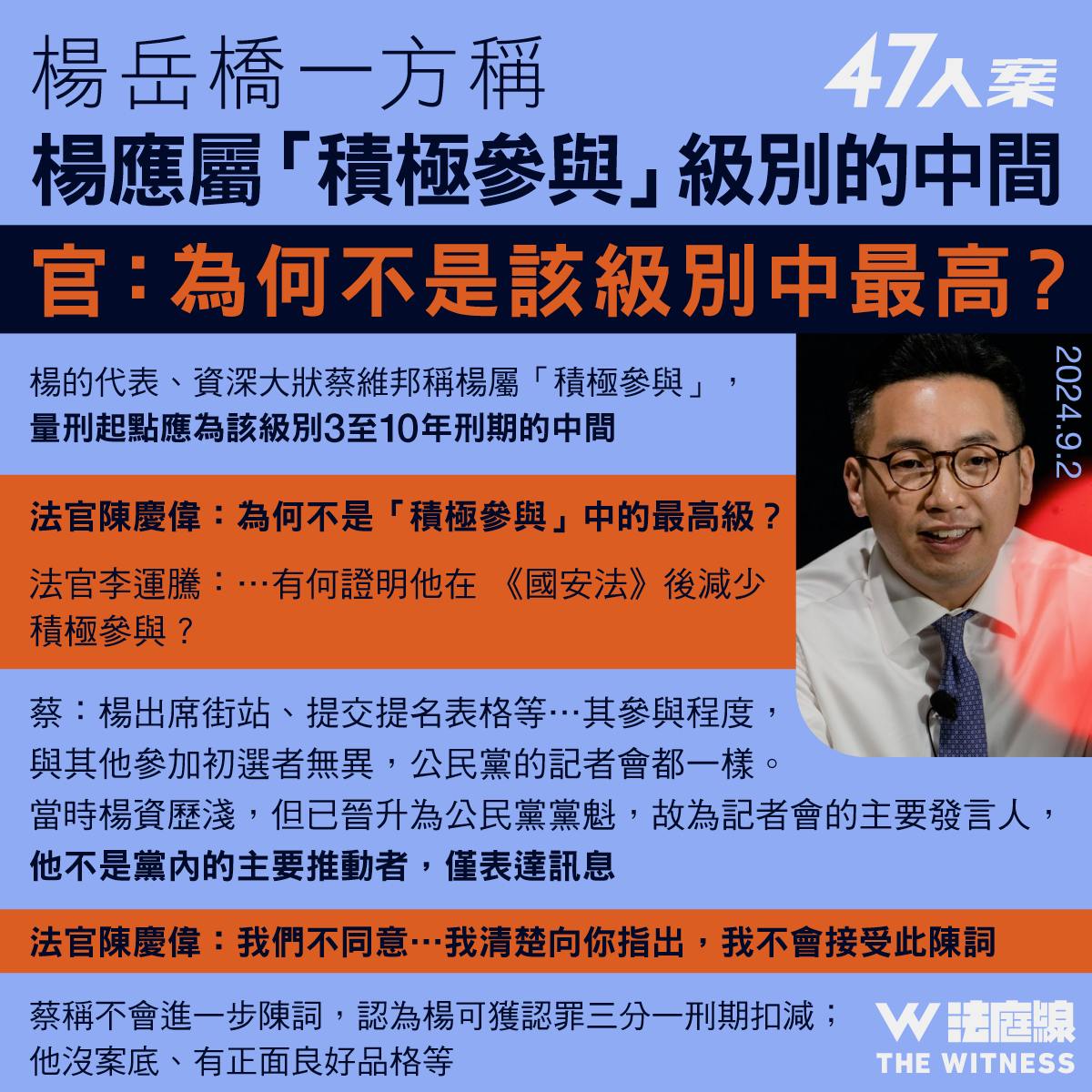 47人案求情 楊岳橋一方:應屬「積極參與」級別的中間 官明言不接納