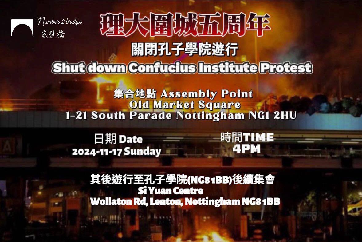 五年已經過去,中共仍然繼續粉飾太平,仍然假裝無事發生,佢哋喺海外文化滲透嘅基地—孔子學院,仍然繼續營運。我哋希望透過香港人繼續企出嚟抗爭,藉此呼籲英國政府關閉孔子學院,令到國際社會可以認識到孔子學院所傳遞嘅唔單只係文化亦都係一種政治控制。