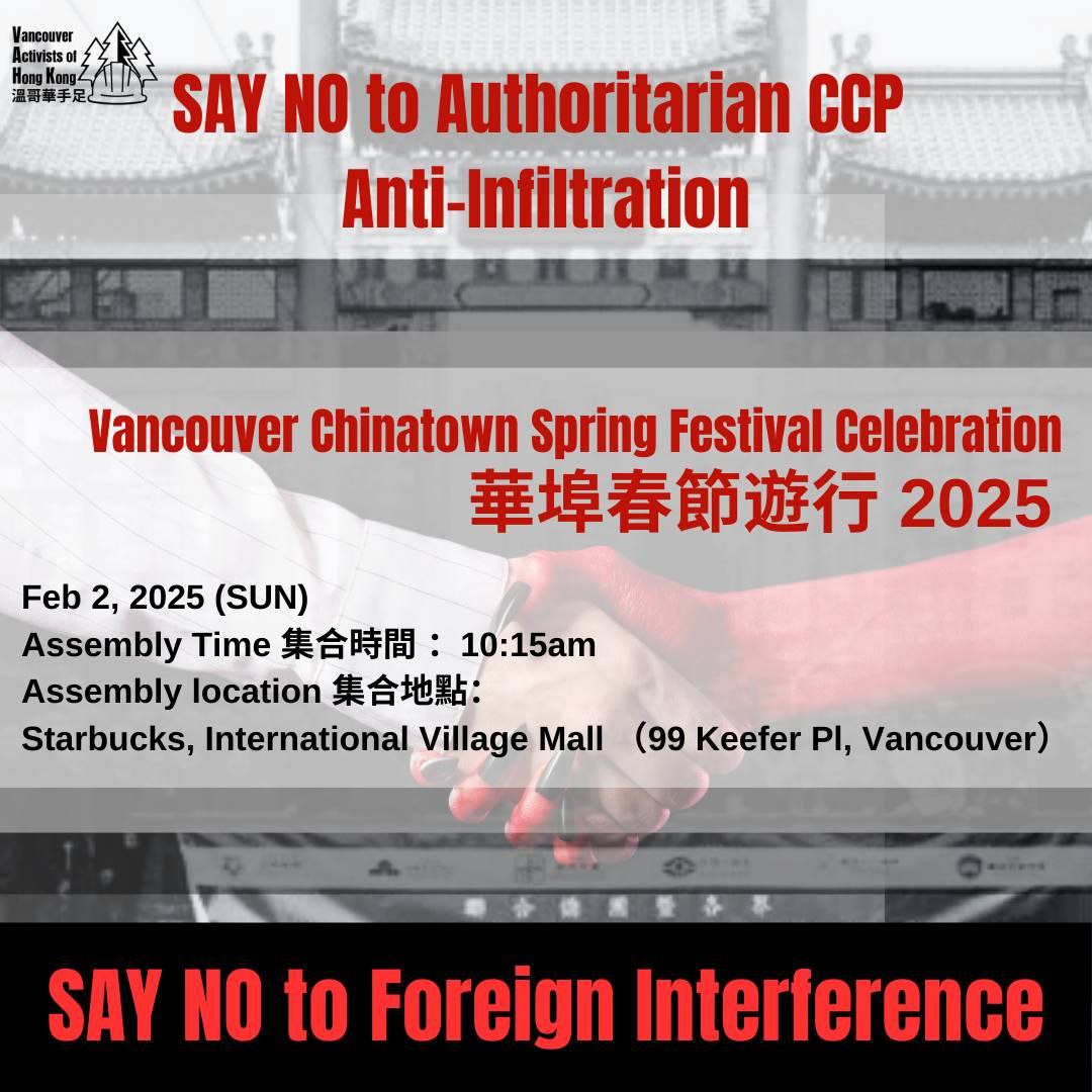 一個由各大奶共組織所舉辦嘅「華埠春節遊行 2025」將喺2月2號舉辦,據悉當日會有唔同議員/國會議員出席。「溫哥華手足」希望可以當日向各議員同大眾宣揚極權中共喺加拿大嘅干預滲透同禍害!