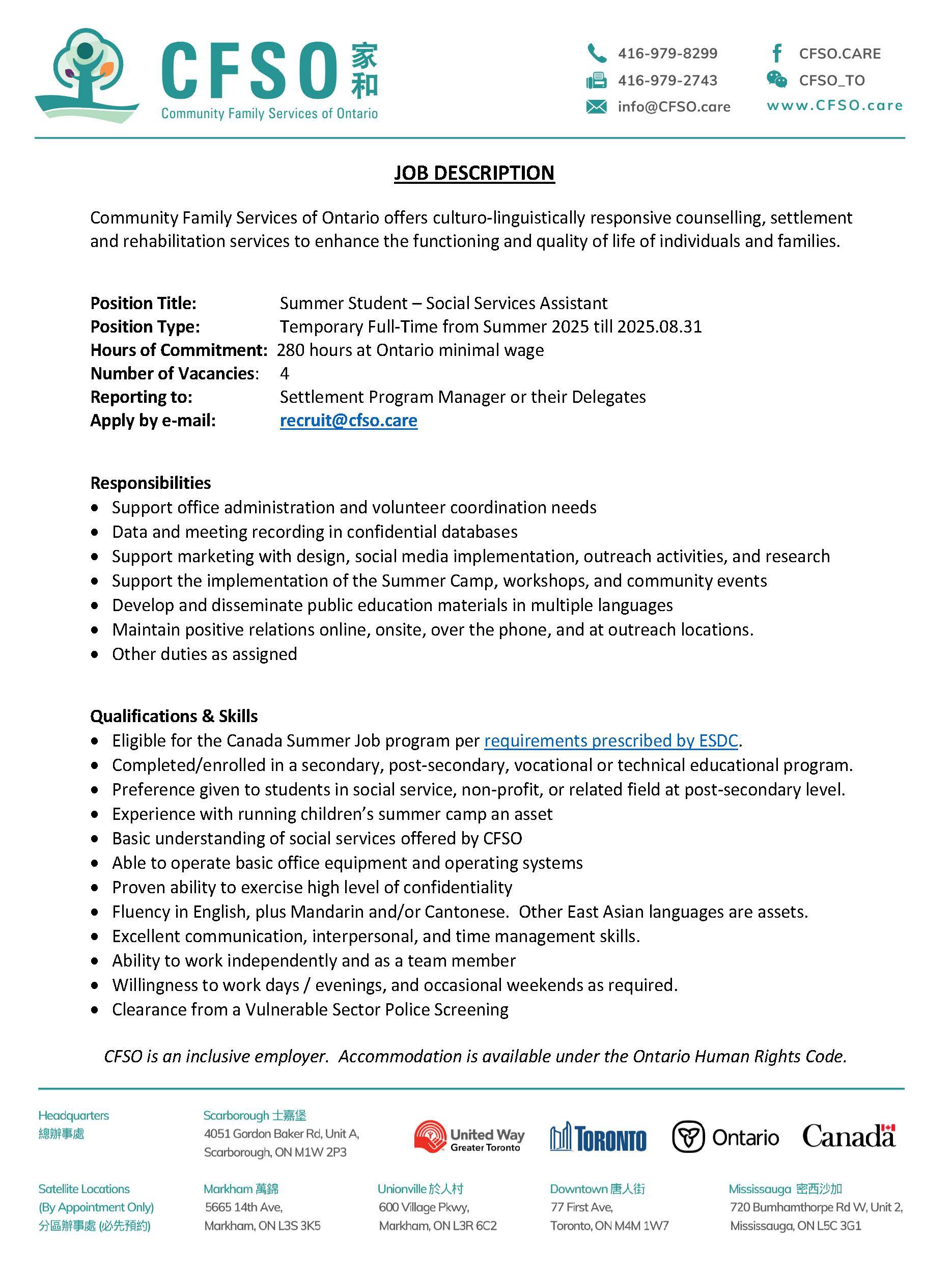 We are hiring 2 Admin Assistants and 4 Social Service Assistants for Summer 2025.