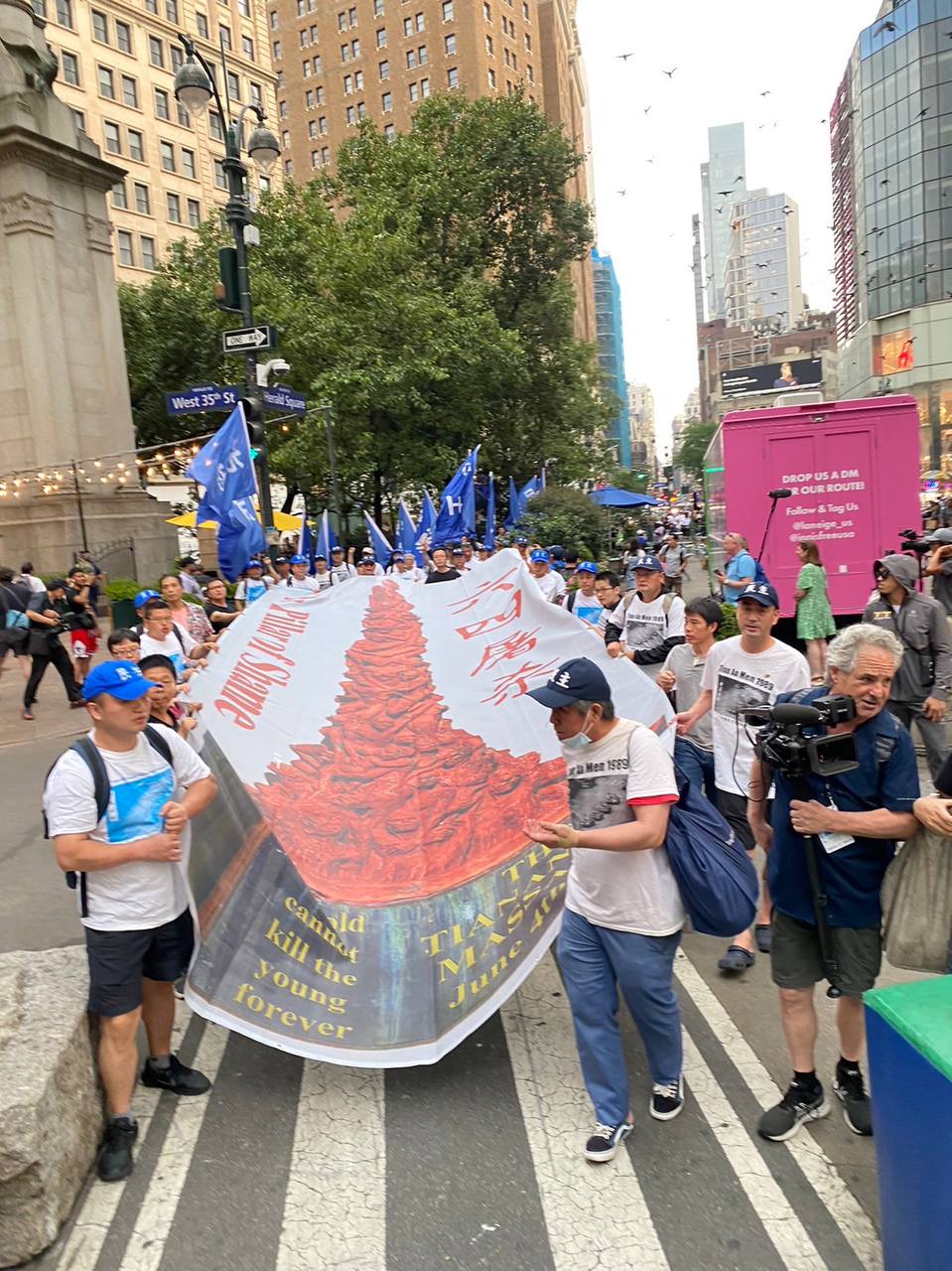 這是紐約近二十年來最大一場紀念六四遊行,隊伍沿途高喊中英文的「打倒中國共產黨」,「母忘六四」等口號,所到之處,不斷有美國人伸出大拇指稱讚。
