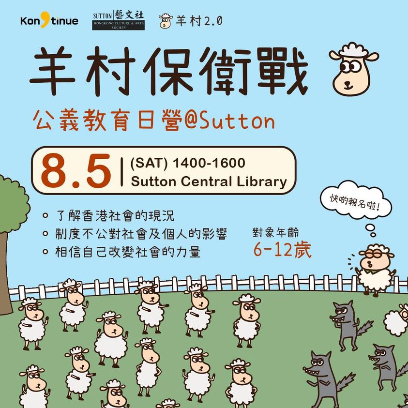 想跟小朋友講述香港的情況,但又怕無從入手? Kongtinue 與Sutton藝文社合作,製作以羊村繪本系列作為背景故事的日營活動,讓小朋友透過遊戲了解香港的情況。活動中,狼隊將會擁有改變遊戲規則的能力,而羊隊需要團結合力對抗狼隊從而勝出遊戲。參加者可以了解到香港社會的現況,制度的不公義對社會造成的影響,以及自身和群體改變社會的力量。名額有限,報名從速!